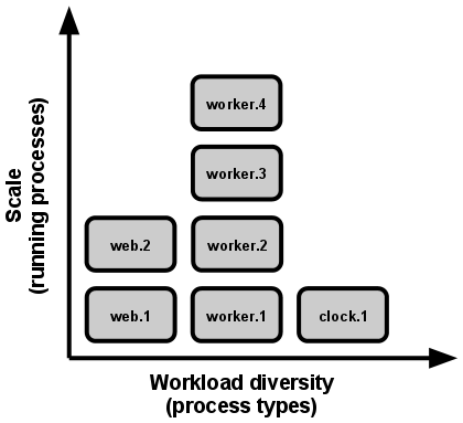1开发人员将不同的工作分配给不同的进程类型。例如,HTTP 请求可以交给 web 进程来处理,而常驻的后台工作则交由 worker 进程负责。定时任务交由 clock 来处理,这样扩展每一类的进程就非常方便,如下图所示: